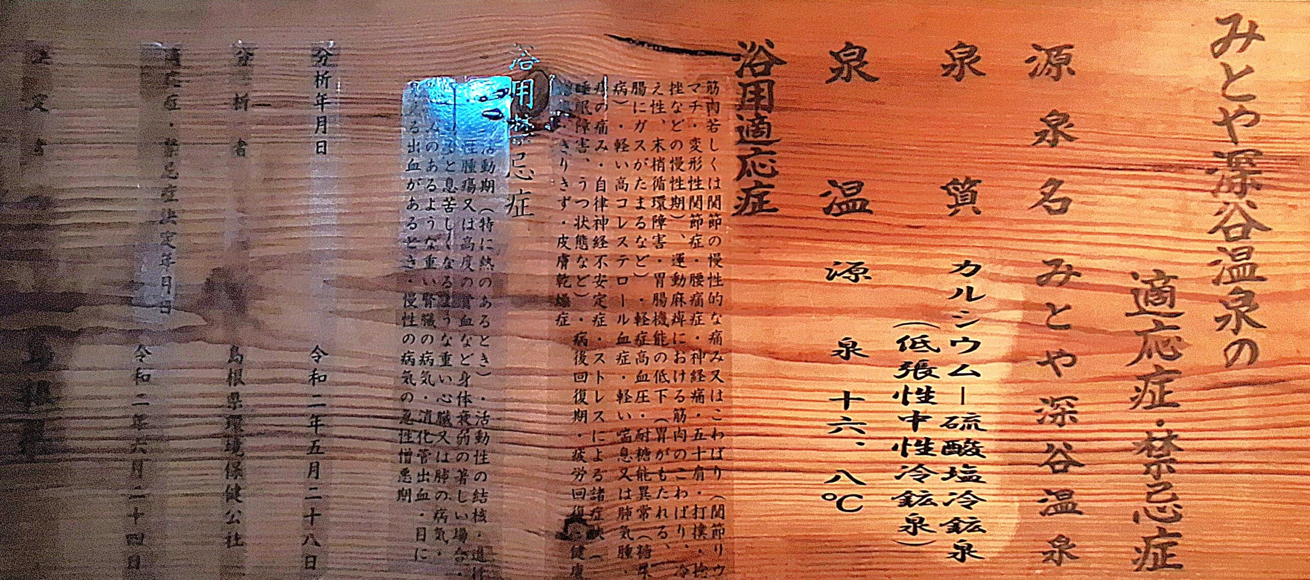 - 効能―カルシウムには鎮静効果が高いため「傷の湯」とも言われています。「硫酸塩泉」には肌の蘇生効果と保湿効果が高いと言われ「肌蘇りの湯」とも言われています。乾燥しがちな肌をしっとり落ち着かせ癒します。高血圧症・慢性関節リウマチ・打ち身・捻挫などに良いと言われ、皮膚感染症・切り傷にもいいと言われています。