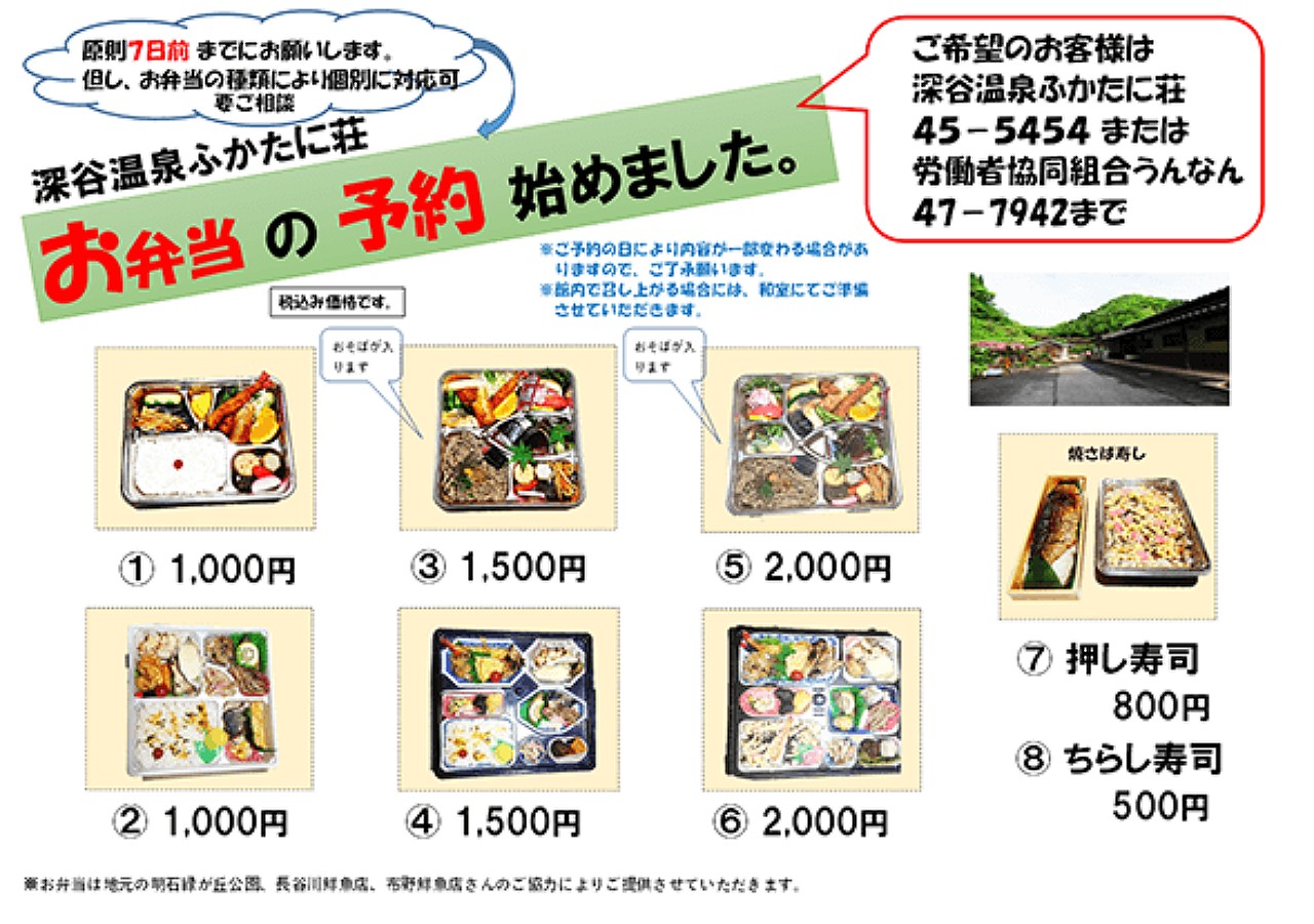- ご希望のお客様は写真のメニューからお弁当を選んでいただき、原則7日前にはご連絡をお願いします。